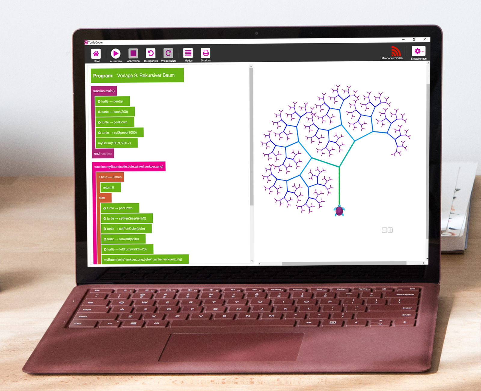Mit der Programmierumgebung TurtleCoder programmiert man in der Programmiersprache Logo eine digitale Schildkröte (die Turtle). Mit den richtigen Befehlen bewegt sich die Turtle über den Bildschirm. Während sie läuft, zieht sie einen Strich hinter sich her. Sie zeichnet also.Vom einfachen Strich bis über Zufallskunst bis zum komplexen rekursiven Baum, kannst du selbst viele strukturelle Elemente des Programmierens eigenständig entdecken. Nach und nach wirst du alle notwendigen Programmierprinzipien kennenlernen und dann deine ganz eigenen Kunstwerke gestalten. Alles, was man abstrakt zeichnen kann, kannst du auch der Schildkröte beibringen. Am meisten Spaß macht es, wenn man anfängt zu experimentieren und auch dem Zufall eine Chance gibt.