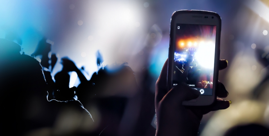 Ein Fotograf fotografiert die Menge der Besucher eines großen Rockkonzertes.