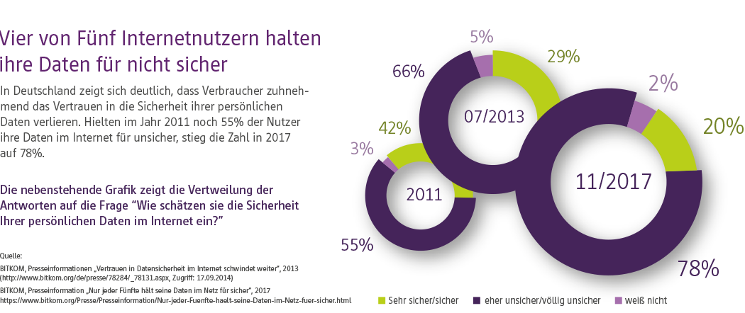 Datenspionage, Big Data, Datenmissbrauch, Identitätsdiebstahl – das sind die Schlagworte, die derzeit tagtäglich zu hören sind. Sie spiegeln wider, was Ereignisse wie die NSA-Affäre oder bekannt gewordene Hacker-Angriffe auf Kundendaten mit sich bringen: Internetnutzer und Verbraucher verlieren massiv das Vertrauen in die Sicherheit ihrer eigenen Daten. Das belegt auch eine Umfrage des Branchenverbandes BITKOM. Demnach gehen rund 80 Prozent der Befragten davon aus, dass ihre persönlichen Daten im Internet nicht sicher sind.