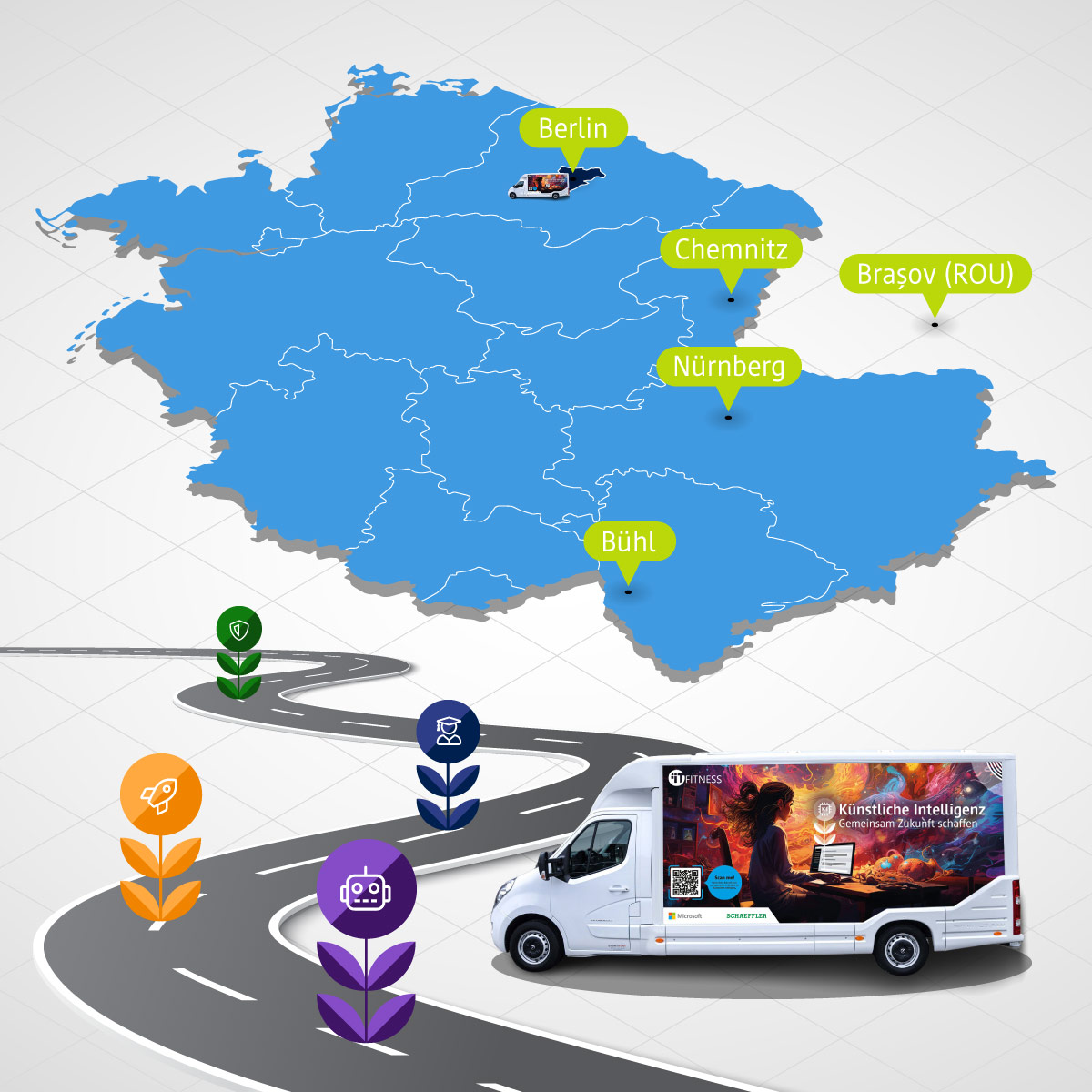 Von April bis November 2024 ist das KI-Mobil in mehreren Regionen unterwegs und begleitet unsere Workshop-Tour an weiterführenden Schulen.In Berlin startet das KI-Mobil seine Tour und fährt in die Schaeffler-Standortregionen im Raum Chemnitz, Brasov (ROU), Nürnberg und Bühl. Dort besucht es teilnehmende Schulen, an denen Workshops stattfinden. Somit können weitere Interessierte Schülerinnen und Schüler der Schule im KI-Mobil vorbei schauen und sich kurze "Lernsnacks" abholen.